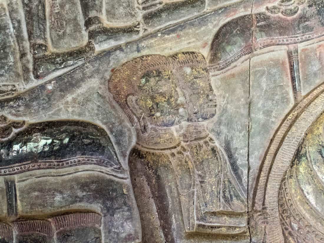 Angkor Wat was originally dedicated to Hindu god Vishnu but transformed into a Buddhist temple shortly after its construction in the 12th century. One of the most remarkable sights within the galleries are the bas-reliefs, especially the “Churning of the Sea of Milk” with Vishnu in the center. Stand back and imagine how this must have looked to the 12th-century visitor when the temples were covered with red and golden color!