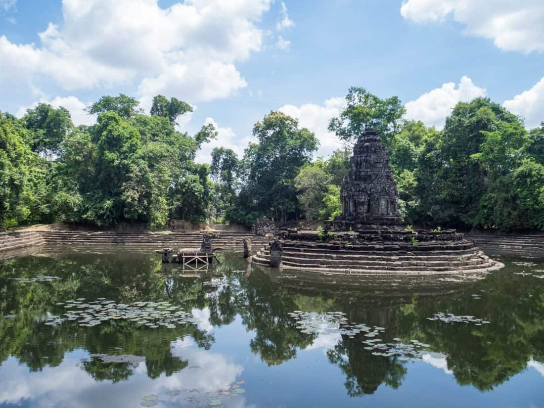 When I visited Angkor, it was Neak Poan (also Neak Pean) that had the “Mebon effect”: To get there, you have to cross about 100 m of water along a small walkway. The water is shallow, and to the left and right you can discover submerged boats and hats that the wind must have blown in. The main remains of Neak Poan are reminiscent of a large fountain in a European castle. The main pool is flanked by four symmetrically aligned side pools, and in its center, a pagoda surrounded by sculptures arises.