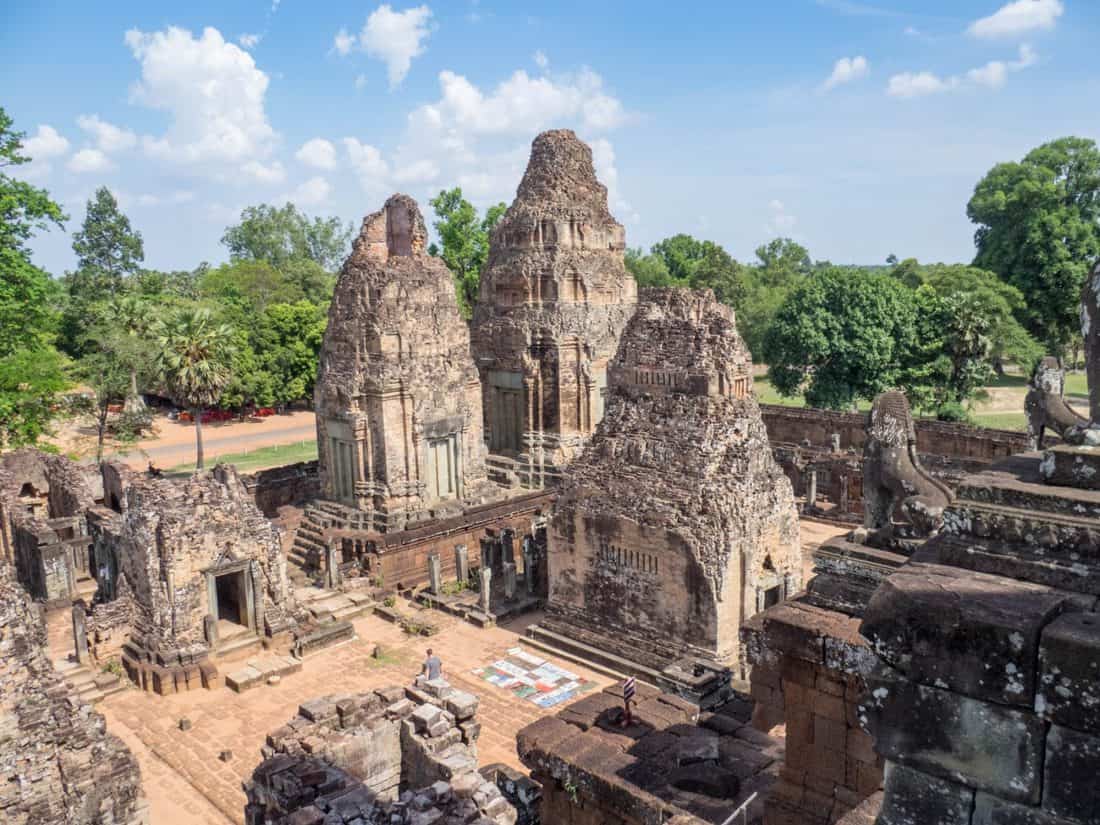 Pre Rup is a 10th-century Hindu temple built from a shining red (orange) stone. The pyramid shape with small pagodas flanked by lion sculptures allows for a quick and easy visit. However, beware of the steep, uneven steps to climb.