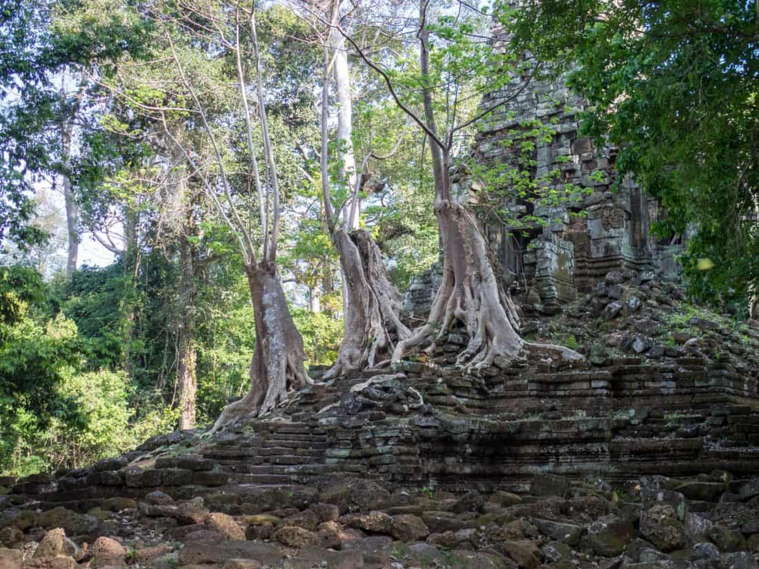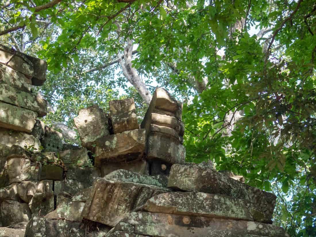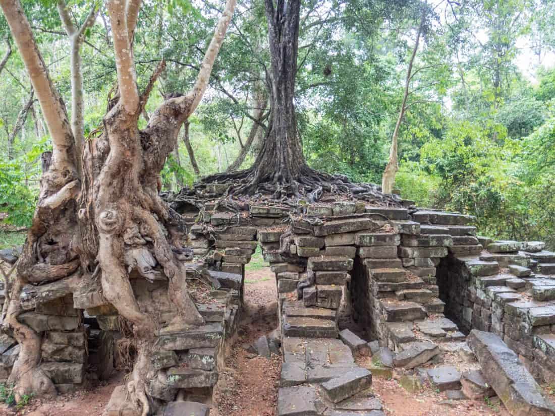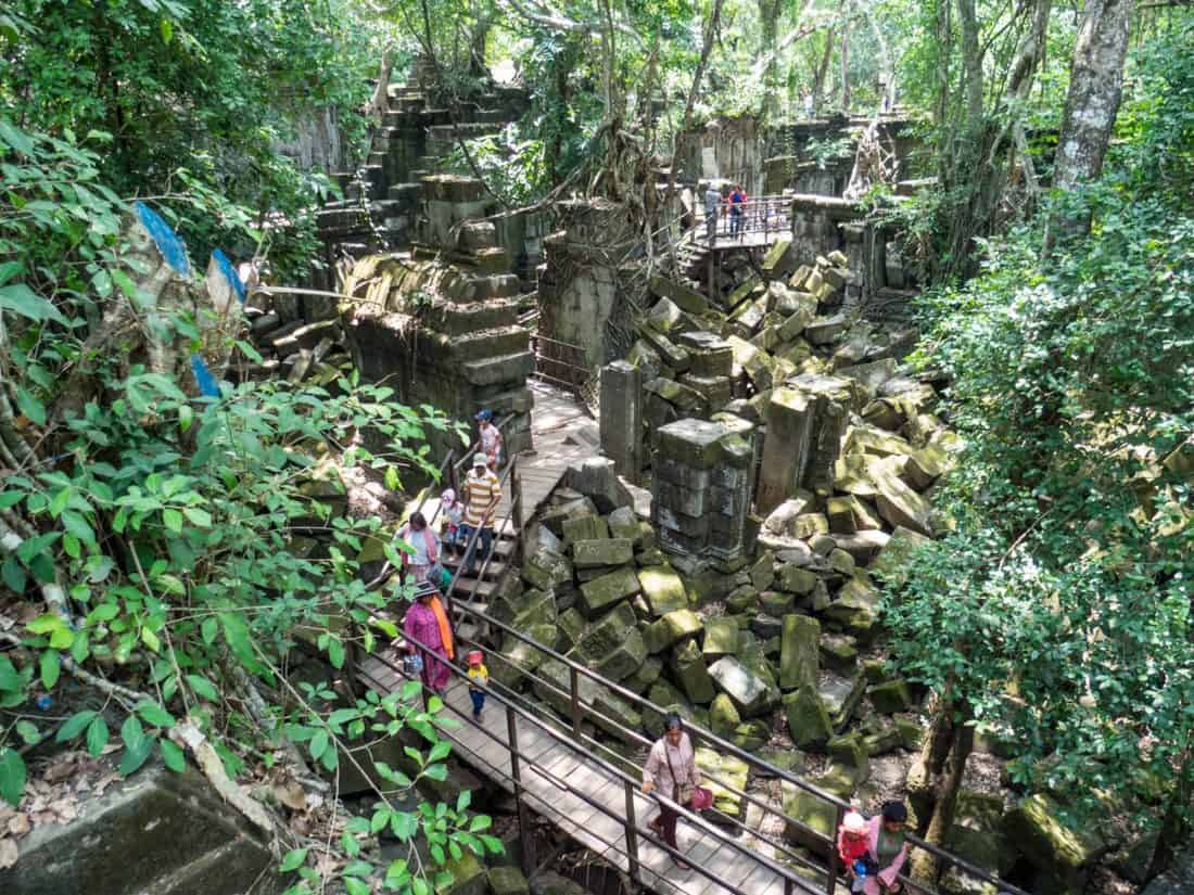 12th-century Beng Mealea is a Hindu temple with some Buddhist depictions, located about 40 km East of Siem Reap, going past Roluos Group and then turning North. The temple is vast with numerous courtyards surrounded by cloisters, but at the same time, only a few restorations efforts have been undertaken. So you see a lot of the site from a raised walkway, and you can still find a few giant trees and vines covering the ground (and the roofs).
