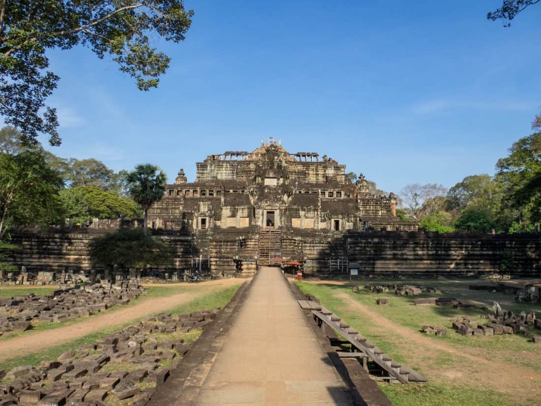 Baphuon is an 11th-century temple mountain, read: tiered pyramid. The temple was initially built in honor of Hindu goddess Shiva and with the grand tower in the center would have measured 50 m in height. However, in the 15th century, the temple was rededicated to Buddha and stones from the collapsed tower and top tiers repurposed to construct a giant, 70 m long Reclining Buddha along the western side of the pyramid. It remained unfinished and was partially dissembled in a mid-20th-century effort to restore the initial complex.