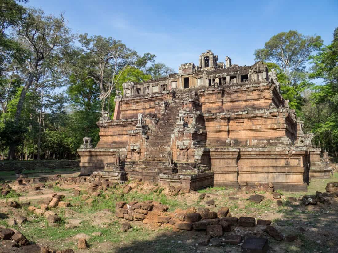 Angkor Thom was the king’s primary residence. The Royal Palace complex covered a large part of the Angkor Thom square. However, not much of the royal quarters remains. Phimeanakas is a small temple pyramid to be used by the king. Archeologists assume that it was once topped by a golden crown.