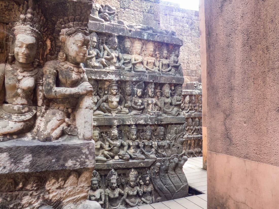 Right next to the Elephant Terrace sits the Terrace of the Leper King (also Palace of the Leper King), named for a sculpture of Hindu god Yama (the god of death), which for some reason in the 15th century reminded people of leprosy (leper). While the sculpture and the outside of the terrace it sits on were unremarkable to me, the interior is one of a kind in the Angkor complex. It consists of two walls: a plain outer one and an inner one covered completely in intricate carvings.