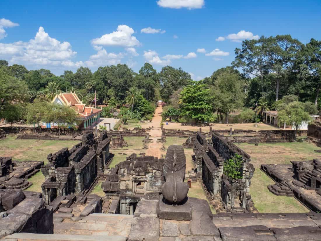 Those staircases are no longer usable (though still visible). Instead, you have two paths circling the hill. To the left, the Elephant Path is the only place in Angkor where you can ride elephants. I wouldn’t recommend it since the elephants are usually not happy to pick up the job of tourist entertainment. To the right is the “Safety Path.” Along the footpath, a few viewpoints have been designated allowing views of the surrounding lands. Make sure you follow the path to end (past where it crosses the elephant path) to get a different angle on the main temple and to see a centuries-old 2 m long Buddha footprint.