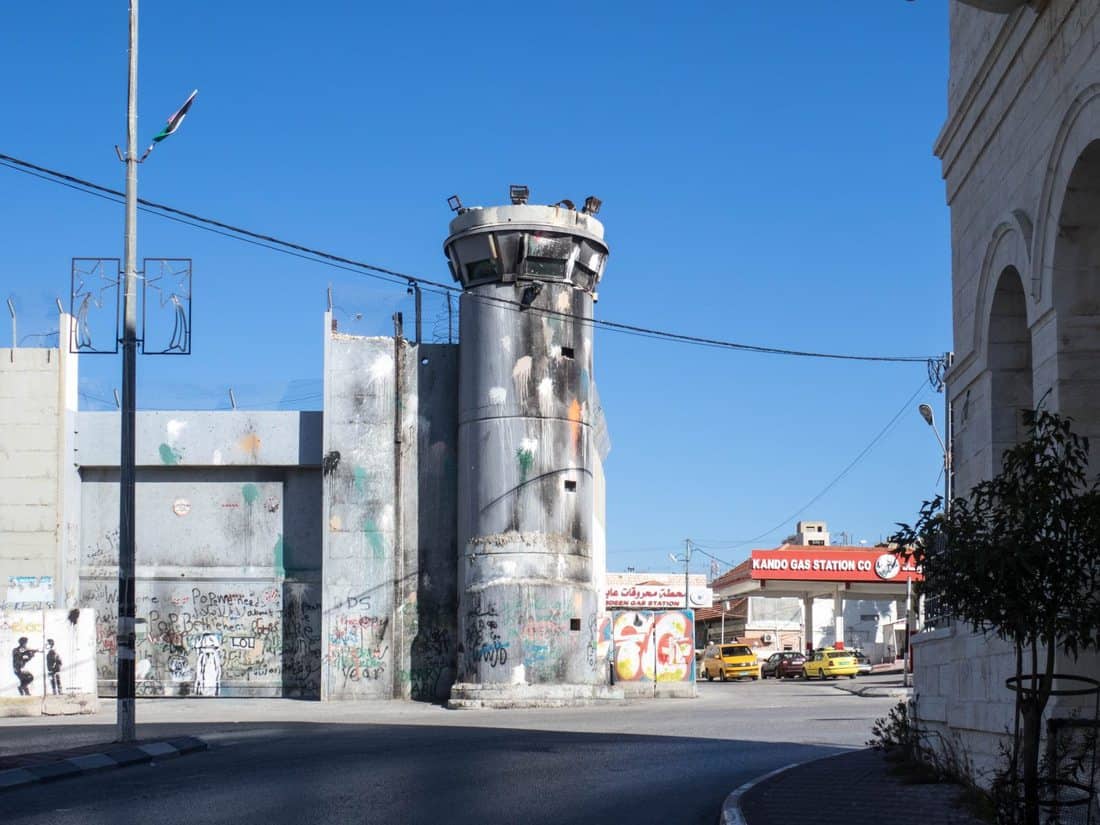 Where Manger and Hebron meet, a guard tower has been hit with paint bombs in red, green, black, and white — the colors of the Palestinian flag. The massive wall that runs left and right from the tower is covered in posters and graffiti.