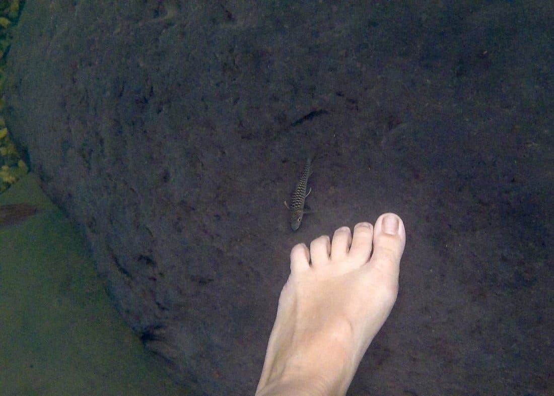 We wade up a small stream, which ends in a cute waterfall, maybe three meters high. It’s not stunning but that’s just what I need to come down: jump into the refreshing waters of the pool under the fall, have the nibble fish nibble the dead cells off my legs and feet, climb to the second small fall a bit further up the stream and do the same again.