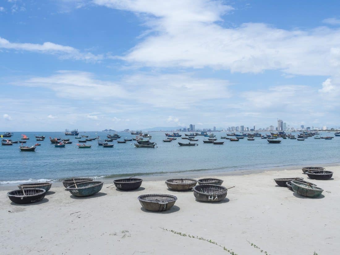 - Da Nang beach with traditional boats and panorama