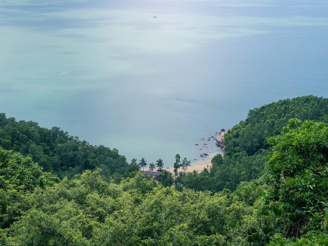 Riding along the western side of the peninsula, my eyes spy a small cove below me. It looks like the perfect place for a swim and a refreshing coconut juice. But on the horizon, I also see menacing grey clouds growing by the minute.
