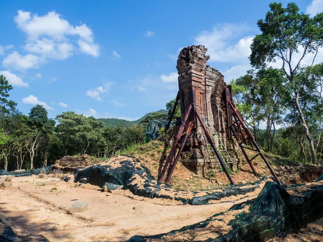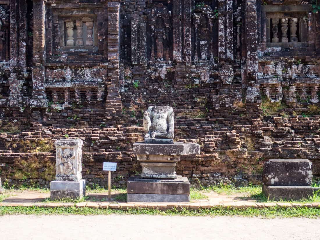 The location of My Son Sanctuary was consciously chosen to be slightly hilly and less suitable for urban development. You can park your scooter in a shaded parking lot (fee payable) and visit a small museum before hopping on the oversized golf cart to the main site (included in the 150,000 dong entrance fee). Once at the temples, exploration takes about an hour (less if it’s a hot day – bring water and a hat). Excavations and restorations are still in full swing, and it will be a few years before visitors can truly appreciate the size and grandeur of the ancient spiritual site.