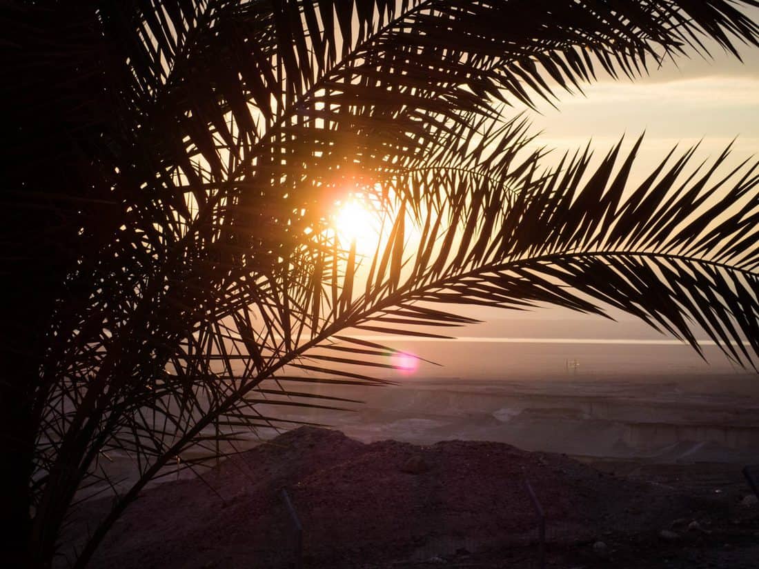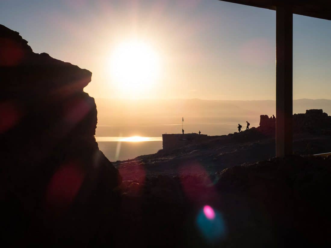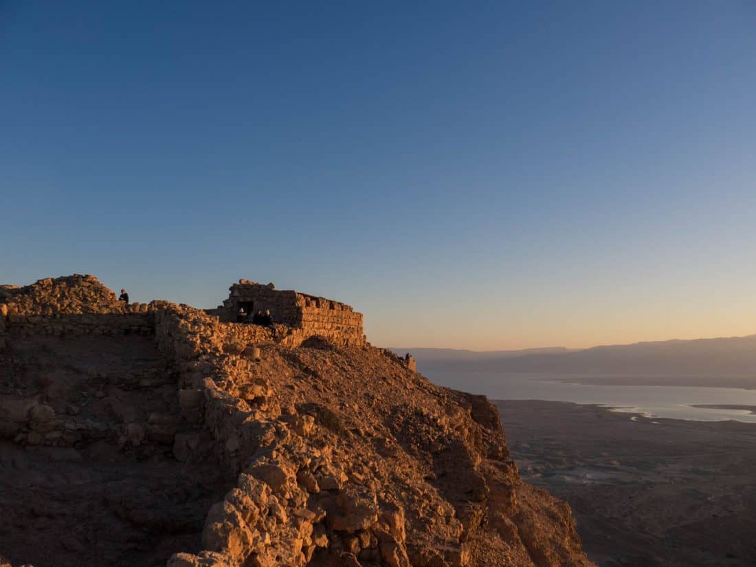 The sun will be coming from Jordan, on the other side of the Southern end of the Dead Sea. Around me, groups have assembled on the ruins of Herod’s fortress. There must be at least 200 people up here.